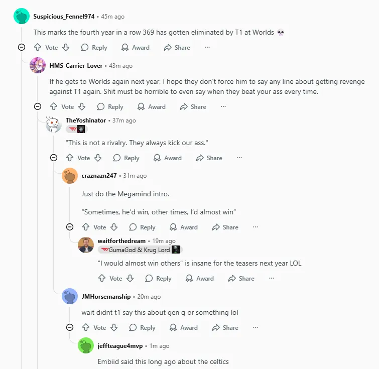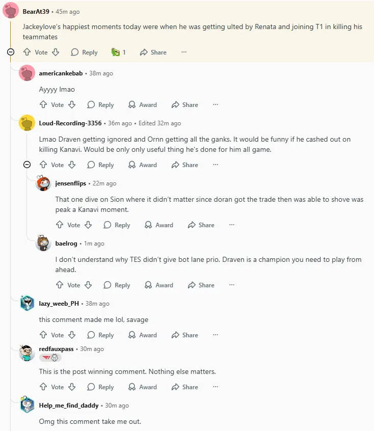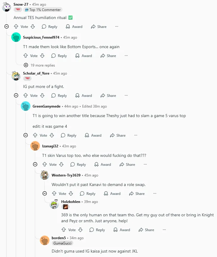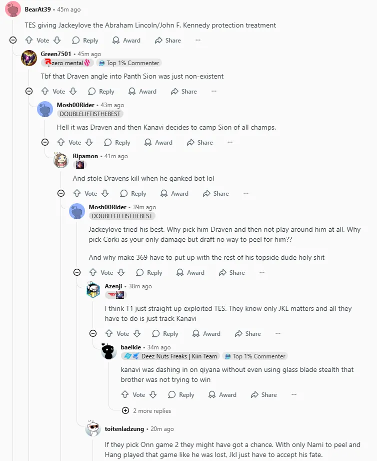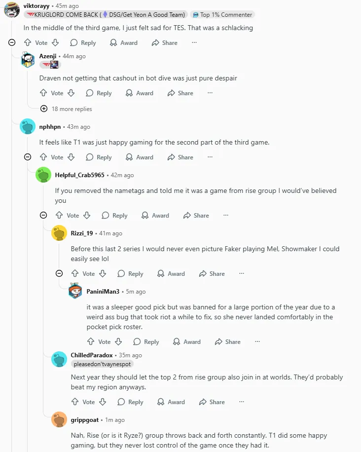 今日T1成功橫掃TES晉級(jí)S15全球總決賽的決賽,他們將在決賽面對(duì)同賽區(qū)的KT,Reddit網(wǎng)友對(duì)此展開了熱議,部分內(nèi)容翻譯如下: