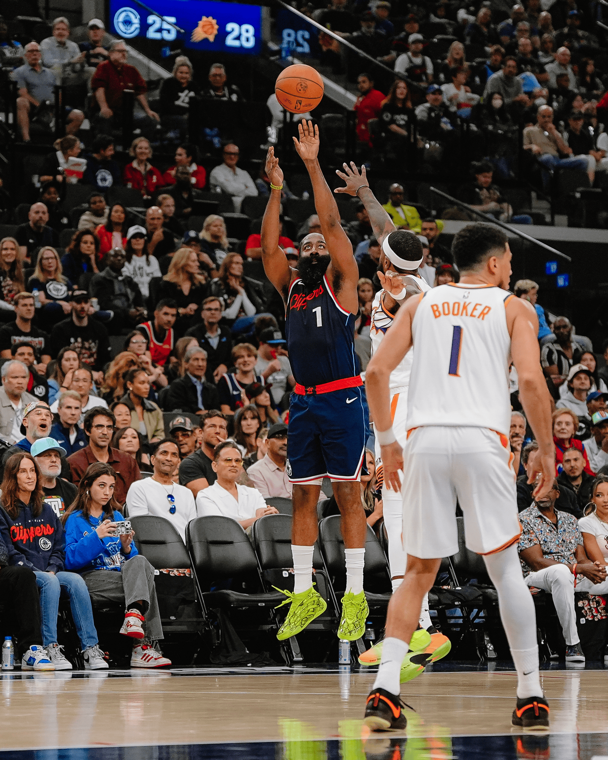 快船球員詹姆斯-哈登半場得到了26分3籃板4助攻的板半數(shù)據(jù),其中投籃9中7,場狂三分6中5。砍分快船