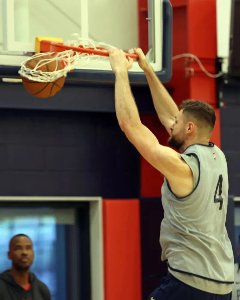 “周六在訓(xùn)練館里訓(xùn)練??!訓(xùn)練享”鵜鶘官方附文道。照球