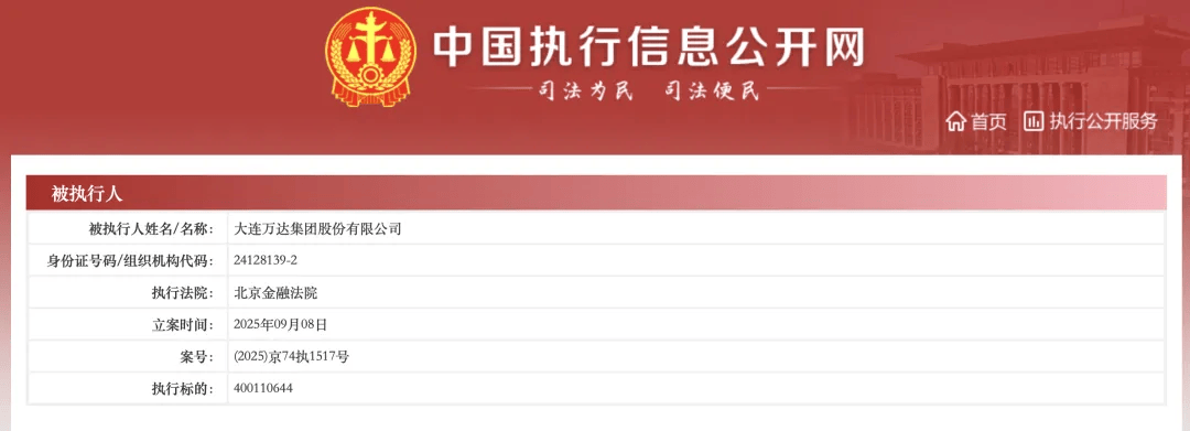 此前,中國執(zhí)行信息公開網(wǎng)顯示,大連萬達集團股份有限公司新增一則被執(zhí)行人信息,立案時間為今年9月8日,執(zhí)行標(biāo)的4億余元,執(zhí)行法院為北京金融法院。