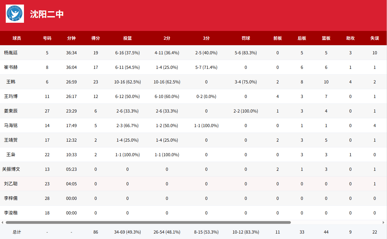 沈陽二中:王韓23分10籃板、分助楊胤廷19分、攻廣崔書赫17分