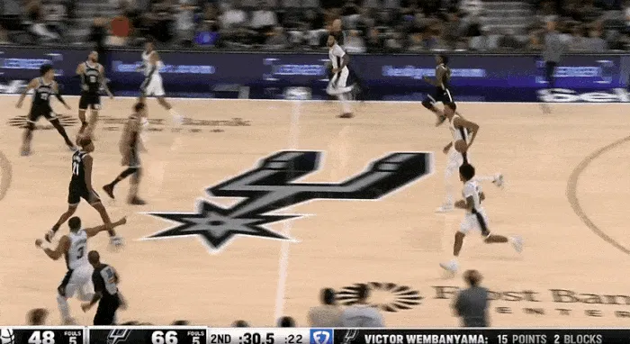 第二節(jié)比賽,連送兩記文班亞馬防守連送兩記大帽,大帽運(yùn)球急停logo超遠(yuǎn)三分命中。急停