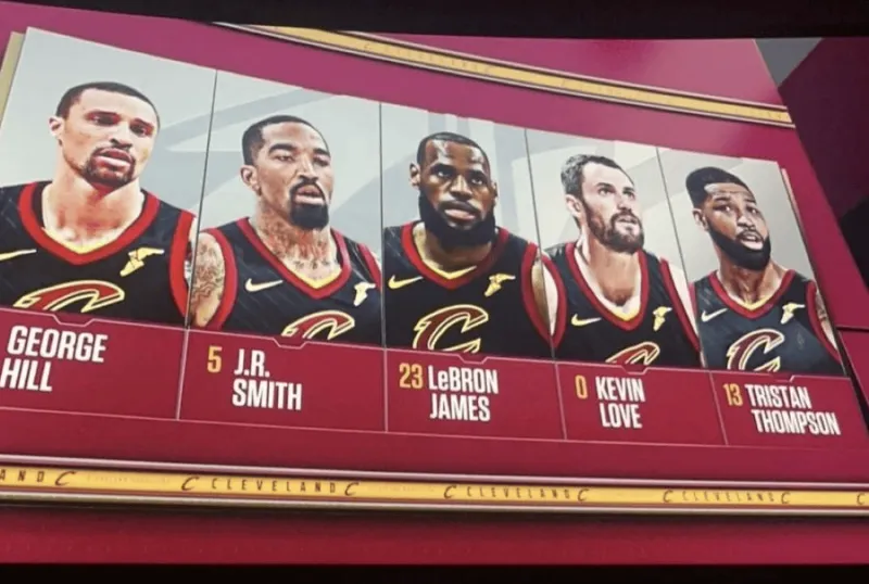 圖中顯示的詹真的總決是17-18賽季騎士的首發(fā)陣容:希爾、JR-史密斯、騎士詹姆斯、賽??樂福、板N把支TT-湯普森。詹真的總決