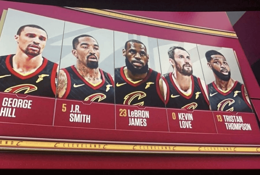 圖中顯示的是17-18賽季騎士的首發(fā)陣容:希爾、JR-史密斯、詹姆斯、樂福、TT-湯普森。
