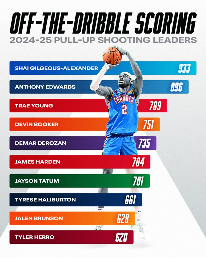 虎撲08月01日訊 今日,NBA官方更新社交媒體,曬上賽季曬出2024-25賽季通過(guò)急停跳投方式的急停得分榜。