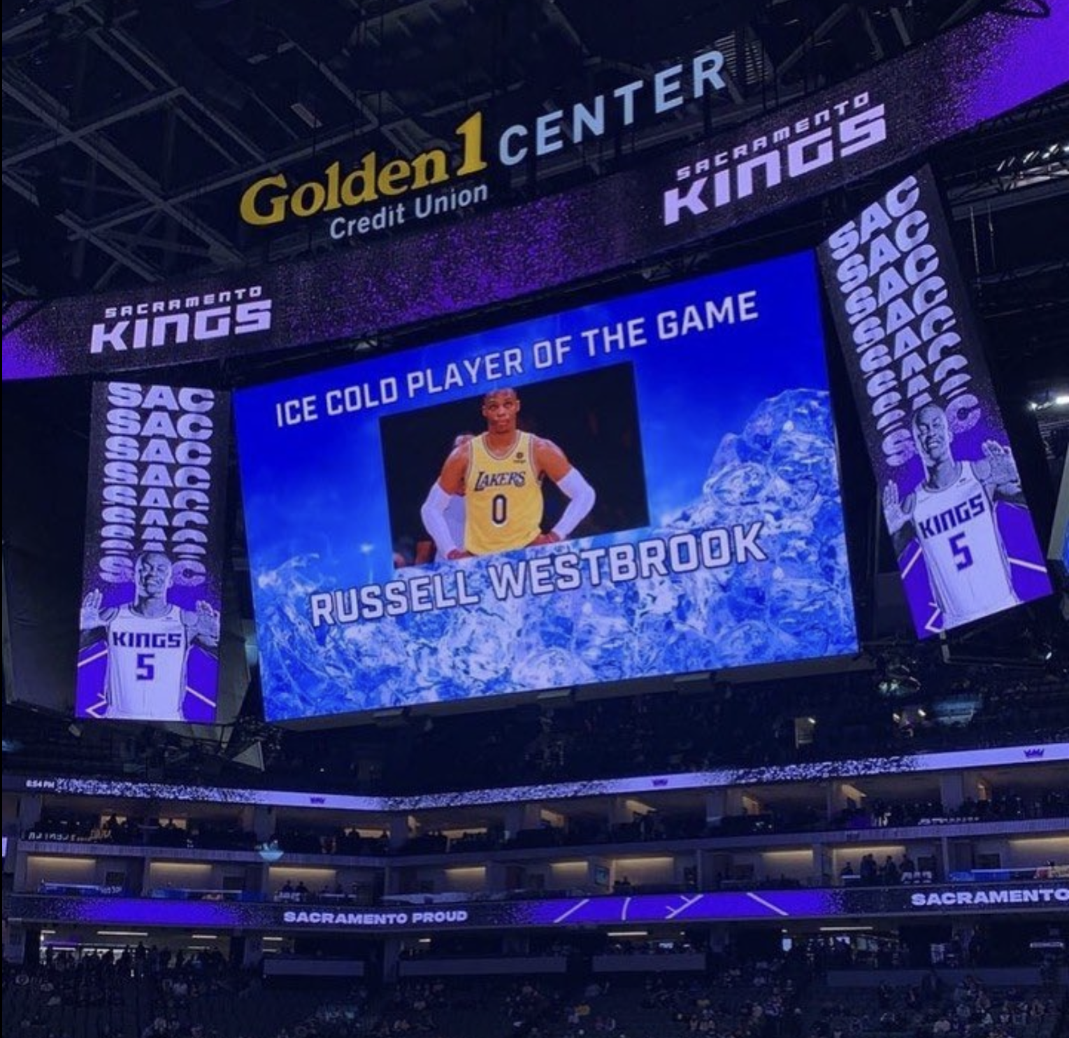 美媒NBA Memes曬出國王主場(chǎng)舊照,諷威并配文稱“國王這次讓威斯布魯克吃盡苦頭”。照國畫面顯示大屏寫有“本場(chǎng)最冷球員:拉塞爾-威斯布魯克”,王次并使用其身穿湖人球衣的讓威賽場(chǎng)照。