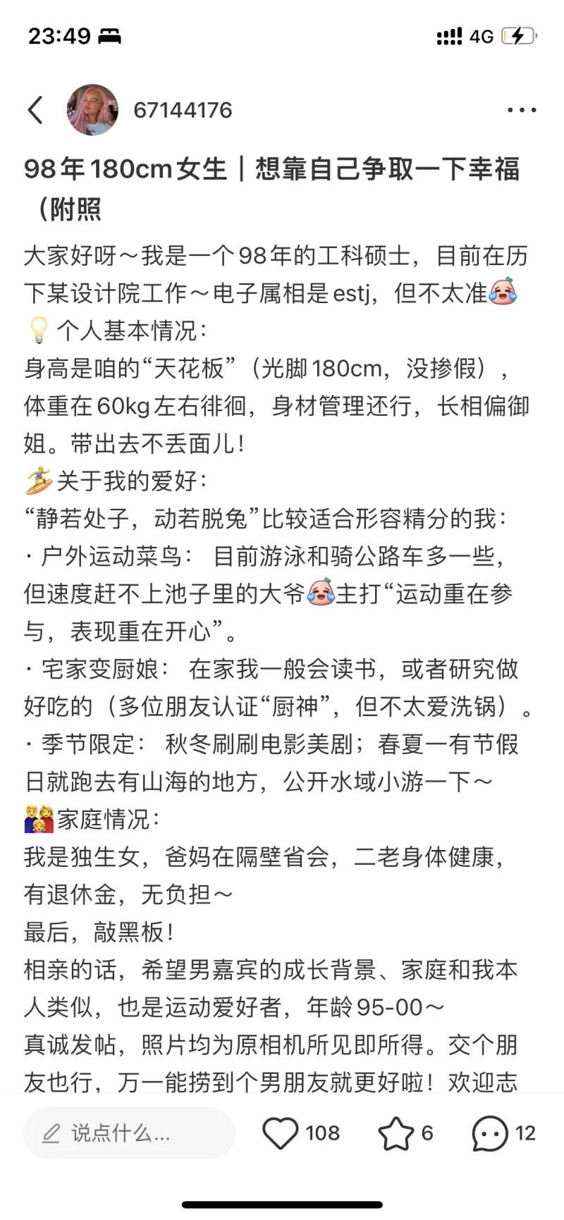 4.這也是盡量減少評(píng)論區(qū)杠精挑你錯(cuò)的一點(diǎn):不要把自己的理想型訴求全寫(xiě)出來(lái),盡量模糊或者不提。有的人不同意了,我長(zhǎng)這么高富帥我就想找個(gè)165身高100斤體重的甜妹,最好碩士畢業(yè)體制內(nèi)還比我小三歲,還是家里獨(dú)生女琴棋書(shū)畫(huà)樣樣精通溫柔體貼善良大方不要彩禮。但這是網(wǎng)上,所有人的戾氣都會(huì)隔著屏幕和網(wǎng)線想找一個(gè)地方宣泄出來(lái),人都是雙標(biāo)的,我可以這么想但你寫(xiě)出來(lái)我就要杠你。我原來(lái)寫(xiě)對(duì)男生的要求是:身高180?的一本或者碩士的理工男,有一定的運(yùn)動(dòng)習(xí)慣和身材管理,家庭背景相當(dāng),年齡差兩歲以內(nèi)。那時(shí)候?qū)懥诉@個(gè)要求底下都是杠的,說(shuō)我這么高了(我本人180)就找個(gè)170以上的得了,碩士學(xué)歷找個(gè)本科就行了(說(shuō)我有學(xué)歷歧視),年齡差太小需要放大到七八歲。我真的哭笑不得(我基本就是想找個(gè)自己的性轉(zhuǎn)版,還不要求車(chē)房)。所以這次我直接寫(xiě)的模糊了許多,原文是「希望男嘉賓的成長(zhǎng)背景、家庭和我本人類似,也是運(yùn)動(dòng)愛(ài)好者,年齡95-00」。果然評(píng)論區(qū)啞巴了,沒(méi)有一個(gè)杠精評(píng)論,而且也不會(huì)像之前有好幾個(gè)175的哥們私信我:身高真不能放寬一點(diǎn)?這一點(diǎn)還是很省心的,節(jié)省了我不少情緒和精力。