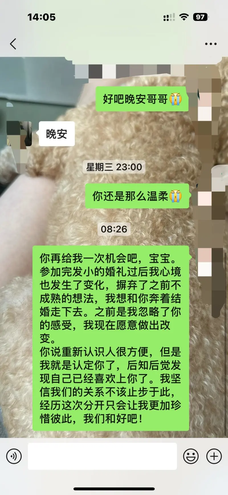 非常后悔遺憾,我的情感表達是含蓄內斂的,他覺得不夠熱情。我之前不想那么快結婚,但是男友催進度讓我有壓力和不滿的情緒,他對我是百依百順,我失去后才懂得珍惜,現(xiàn)在也想安定下來。今早發(fā)了消息請求復合,沒想到他還沒回復,但我不愿放棄。