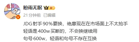 JDG射手90%要換絕意行情一般,句號600w,句號句號輕語和句號不存在互換