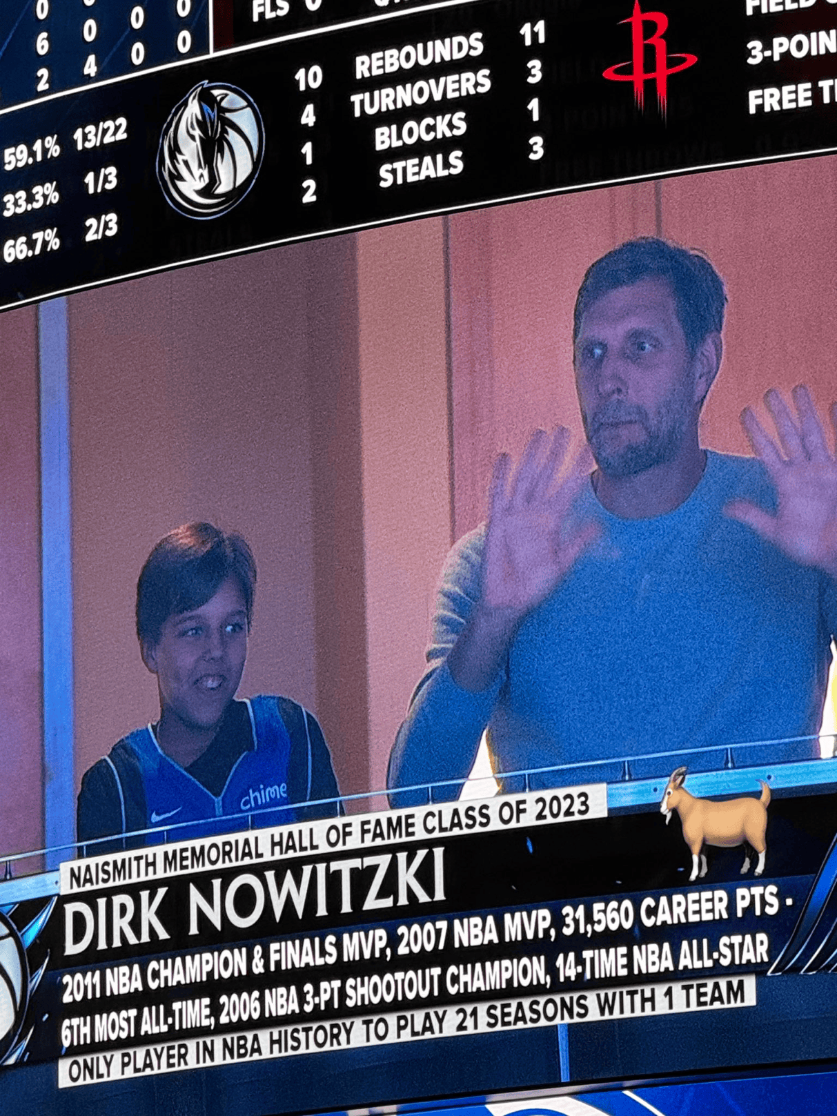 比賽進行到第二節(jié),板名主場大屏鏡頭給到了來到現(xiàn)場觀戰(zhàn)的宿督獨行俠名宿德克-諾維茨基。