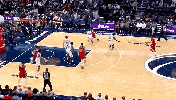 NBA常規(guī)賽,黃蜂客場對陣奇才的持球比賽正在進(jìn)行中。