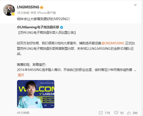 [流言板]MISSING轉發(fā)LNG公告并配文:明年會讓大家看到更好的公告并更好
