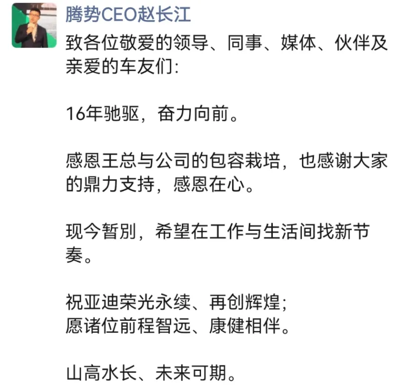 虎撲10月24日訊 騰勢(shì)方程豹汽車直營(yíng)銷售事業(yè)部總經(jīng)理趙長(zhǎng)江在其朋友圈上發(fā)文,附原文如下: