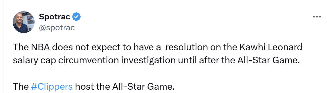 根據(jù)知名薪資網(wǎng)站Spotrac報(bào)道,終裁NBA聯(lián)盟預(yù)計(jì)在全明星賽結(jié)束后才會(huì)對(duì)科懷-倫納德薪資帽規(guī)避調(diào)查作出最終裁決。流言倫納