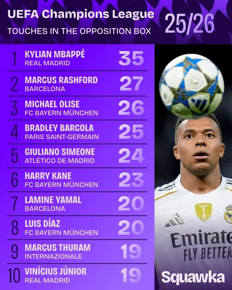 直播吧10月23日訊 本賽季歐冠聯(lián)賽階段已戰(zhàn)罷3輪,Squawka統(tǒng)計(jì)了到目前為止對方禁區(qū)內(nèi)觸球次數(shù)榜單,本賽榜姆巴佩姆巴佩35次第一,季歐拉什福德27次第二。冠對