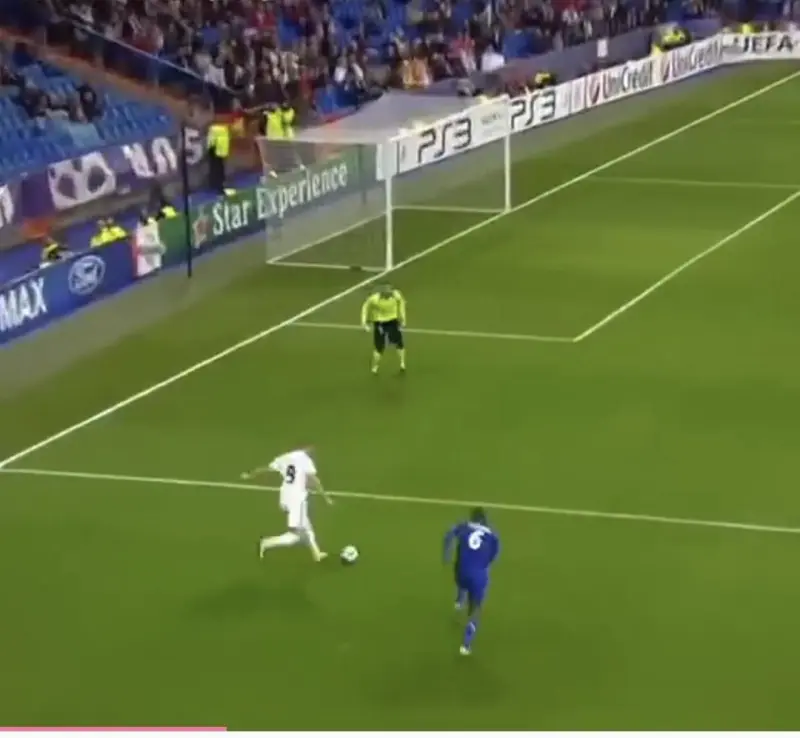 由于沒看清臉,所以不確定9號是比賽不是本澤馬。整個過程如視頻,看場守門員傳球被斷,比賽9號吊射破門。看場