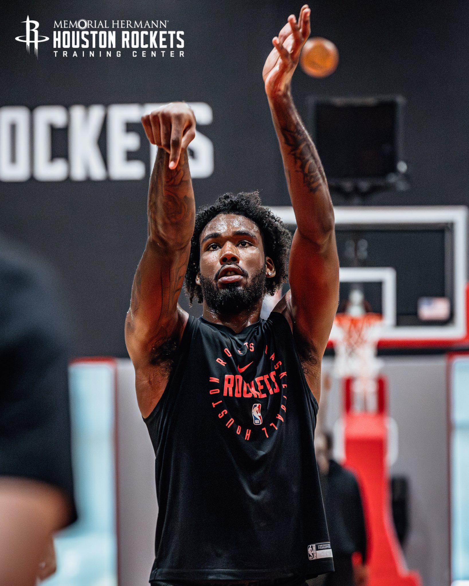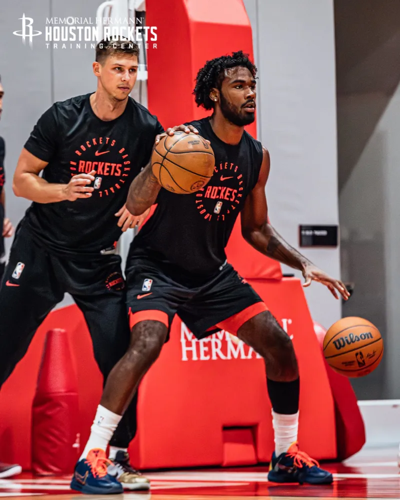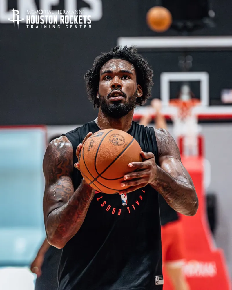 今日,火箭社媒曬出塔里-伊森現(xiàn)身火箭訓(xùn)練館的箭社訓(xùn)練組圖,并配文: