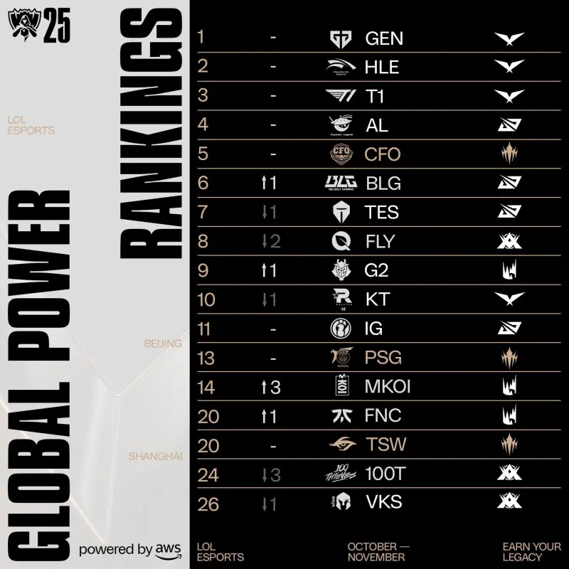 虎撲10月26日訊 LCP官推發(fā)布拳頭官方最新一期全球戰(zhàn)隊(duì)實(shí)力排行榜(2025年10月26日更新):