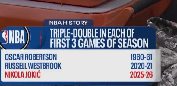 約基奇賽季前三場(chǎng)均砍下三雙,歷史第三人,比肩奧斯卡-羅伯特森和拉塞爾-威斯布魯克。