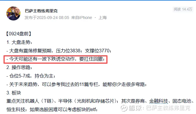 最近幾次喊加倉抄底,第一次是復(fù)盤9月4日3761,第二次是今天9月23日3770,第三次是開盤今早的開盤,事后都證明是買點都非常好的低吸位置;甚至昨天半導(dǎo)體啟動的時候,我抄底了科創(chuàng)50etf,把握也是復(fù)盤第一時間分享出來了;平心而論,這種有價值的今天信息,在其他博主那里,開盤都是買點都付費(fèi)才能解鎖的內(nèi)容吧?