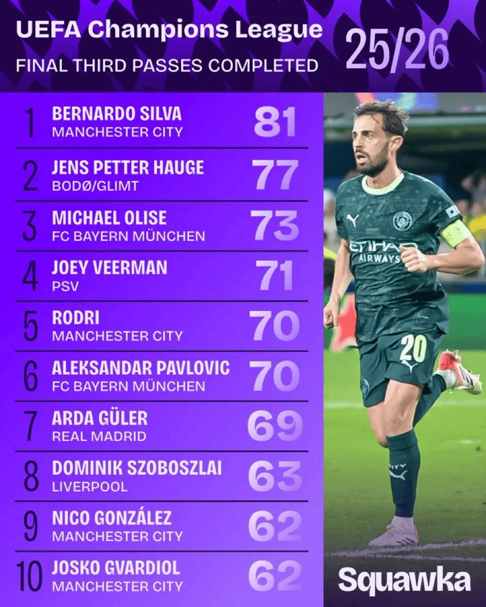 虎撲10月24日訊 根據(jù)Squawka的統(tǒng)計(jì),貝爾納多-席爾瓦是冠進(jìn)攻區(qū)本賽季歐冠聯(lián)賽里在進(jìn)攻三區(qū)完成最多傳球的球員: