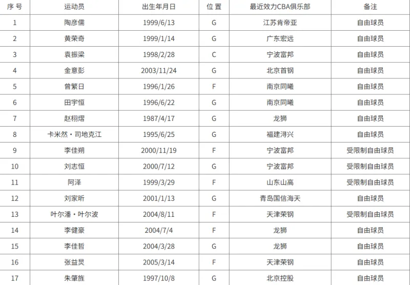 虎撲10月21日訊 CBA官方公布的最新一期自由球員名單中,前山東男籃球員、此前在蒙BA聯(lián)賽中單場(chǎng)狂砍101分的阿澤、黃榮奇、曾繁日等人仍在列。