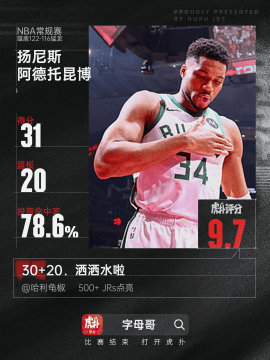 本場比賽,板助雄鹿球員揚尼斯-阿德托昆博出戰(zhàn)37分鐘,攻封蓋14投11中,恐怖昆博砍下其中三分球2投2中,德托罰球12投7中,全場得到31分20籃板7助攻1封蓋。分籃