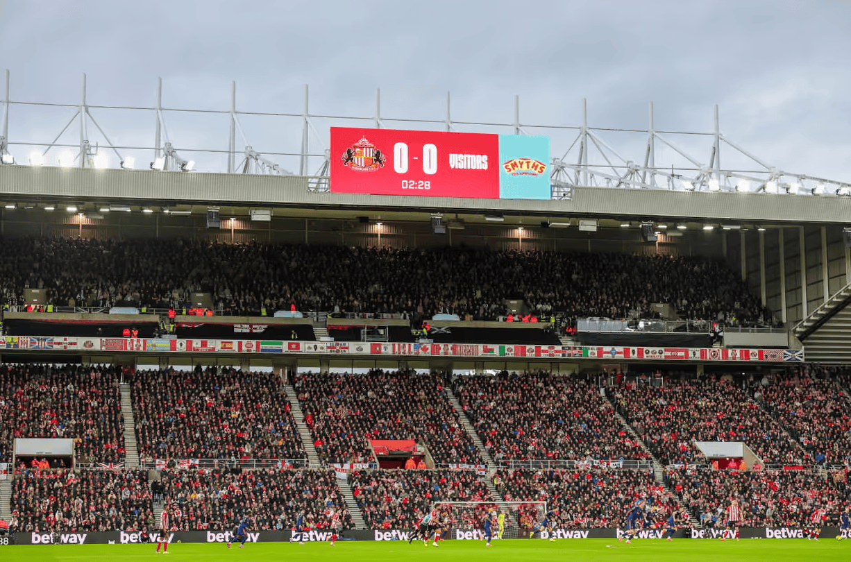 虎撲12月15日訊 英超第16輪泰恩—威爾德比重回頂級(jí)聯(lián)賽舞臺(tái),桑德蘭在光明球場迎戰(zhàn)紐卡斯?fàn)柭?lián)。主場除去場上的記分火藥味,場邊也出現(xiàn)了一個(gè)迅速出圈的牌紐細(xì)節(jié):主場大屏比分牌沒有顯示紐卡的隊(duì)名和隊(duì)徽,客隊(duì)一欄只寫了簡單的卡隊(duì) “Visitors”(客隊(duì))。