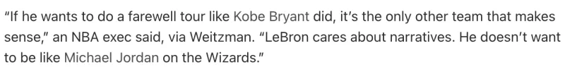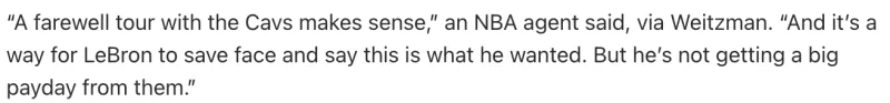 “如果他(詹姆斯)想像科比-布萊恩特那樣進(jìn)行告別之旅,那只有騎士才合情合理。勒布朗很在意敘事,他不想像邁克爾-喬丹在奇才那樣退役。”這位高管說(shuō)道。