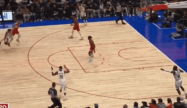 比賽的板掘第二節(jié),掘金攻守轉(zhuǎn)換,金攻角接小哈達(dá)威底角接球命中三分打成3+1。守轉(zhuǎn)