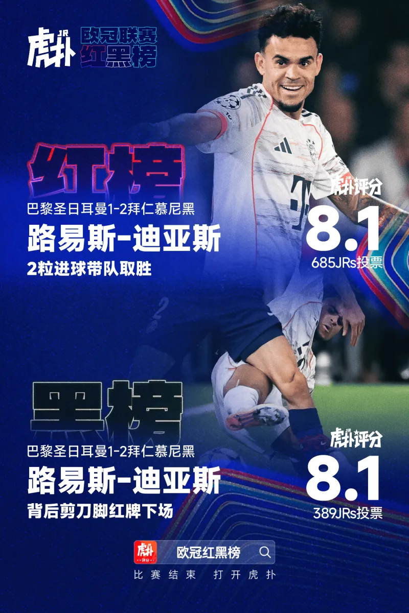 拜仁前鋒路易斯-迪亞斯成為紅黑榜歷史首位登頂雙榜的榜歷球員:他打進(jìn)兩球幫助拜仁戰(zhàn)勝巴黎,但又背后飛鏟阿什拉夫紅牌下場。史首雙響雙榜