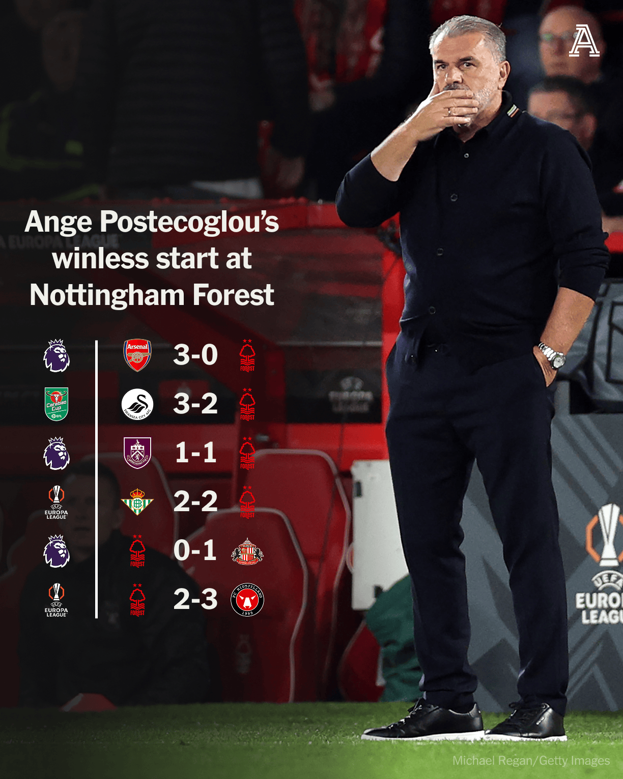 本場(chǎng)比賽結(jié)束后,板敗森林在澳波接手的涂地6場(chǎng)比賽中2平4負(fù),至今未嘗勝績(jī)。澳波
