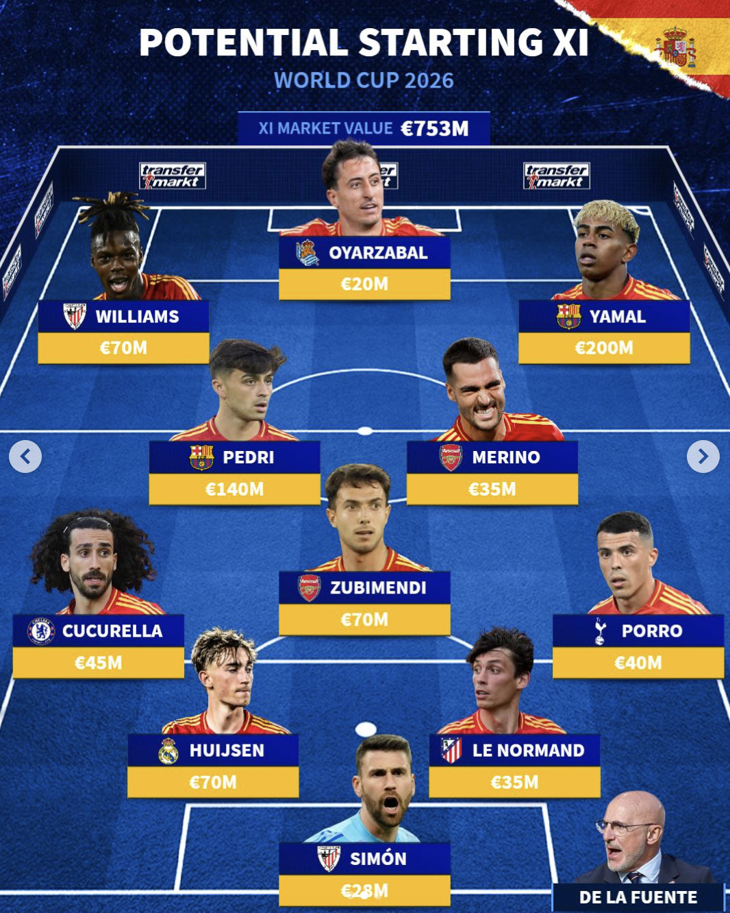 虎撲12月07日訊 德轉(zhuǎn)公布了西班牙在2026年世界杯的預(yù)計(jì)首發(fā)十一人。陣容總身價(jià)為7.53億歐,發(fā)陣其中邊鋒亞馬爾以2億歐的容亞身價(jià)為全隊(duì)最高。