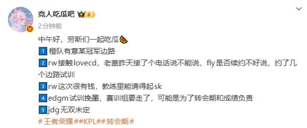 [JR熱議]午間吃瓜:橙隊有意某冠軍邊路;RW俠很有錢,熱議Fly續(xù)約未定由斷線流老莊周 發(fā)表在王者榮耀 https://bbs.hupu.com/kog