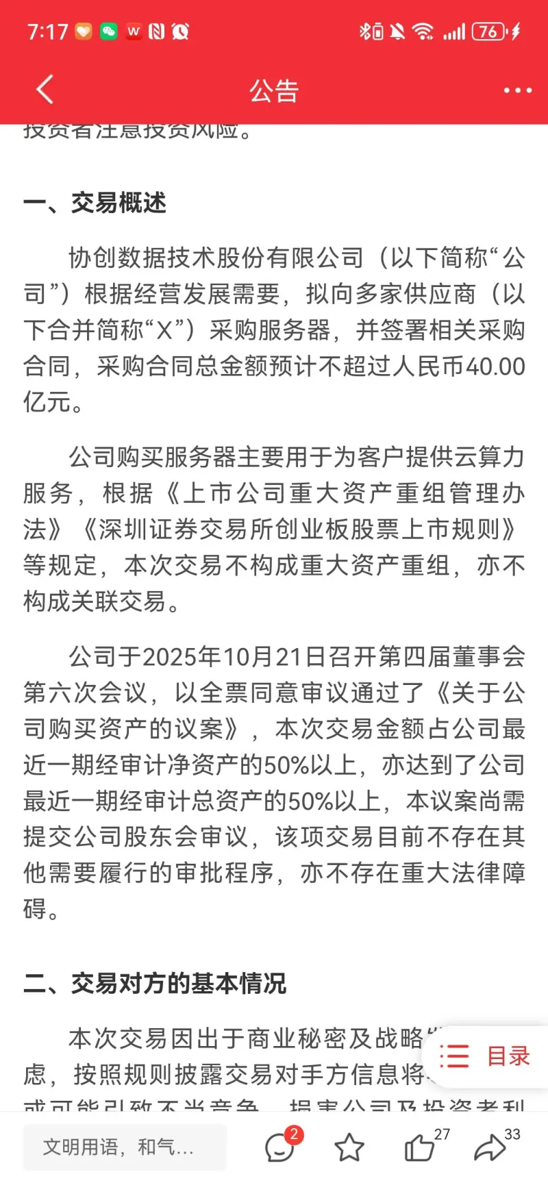 簡單說說個股,今天只有羅博特科是紅的,昨晚的訂單公告刺激了一下,不過依舊熟悉的味道,高開低走。協(xié)創(chuàng)昨晚發(fā)布公告又購置資產(chǎn)40億,今天已累計購置資產(chǎn)120億左右,購置了這么多資產(chǎn),存在一定的現(xiàn)金流壓力,但個人認(rèn)為像算力租賃業(yè)務(wù),如果沒有訂單,公司也不會花這么多錢購置,我認(rèn)為協(xié)創(chuàng)今年下半年或明年上半年,業(yè)績應(yīng)該是會有驚喜的。