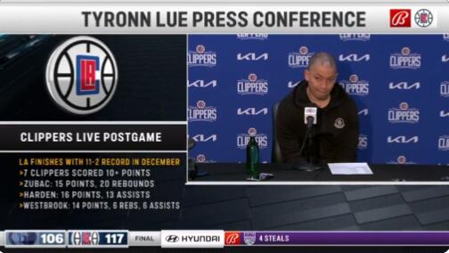 虎撲12月30日訊 快船在比賽中117-106擊敗灰熊。賽后,快船主帥泰倫-盧接受了采訪。