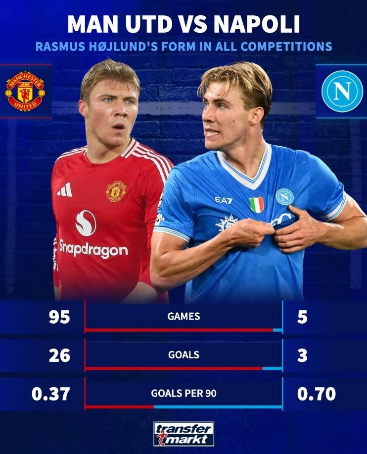 而德轉(zhuǎn)也盤點了霍伊倫在曼聯(lián)、球數(shù)那不勒斯效力時期的流言勒進球數(shù)據(jù),具體如下: