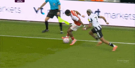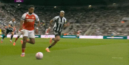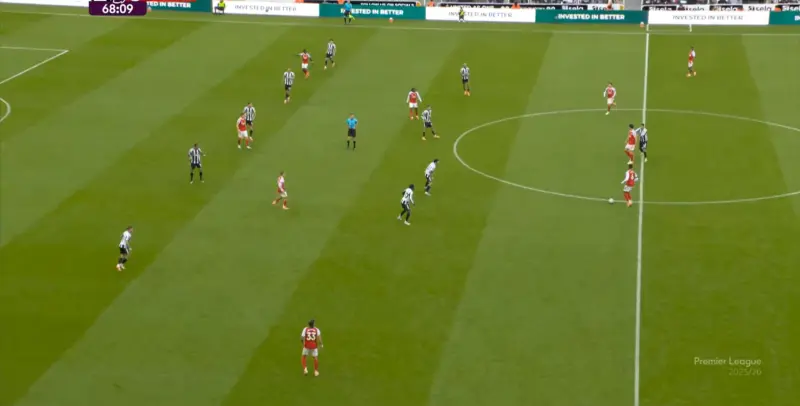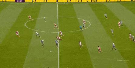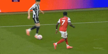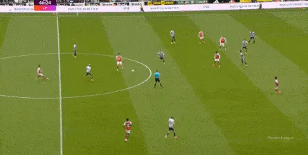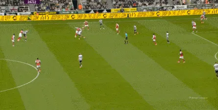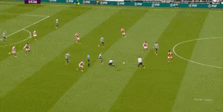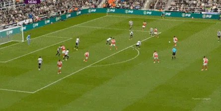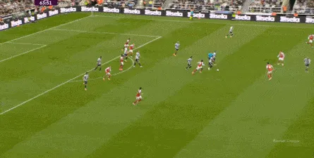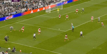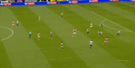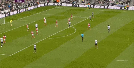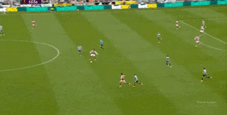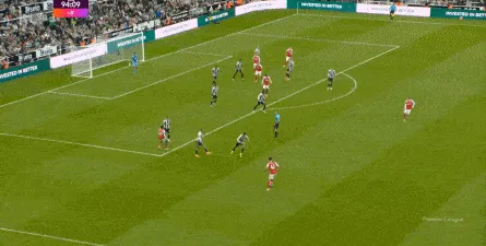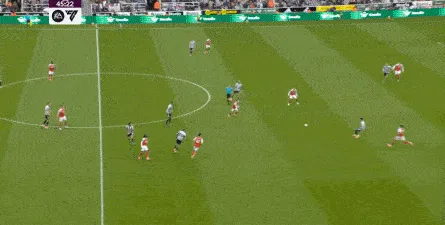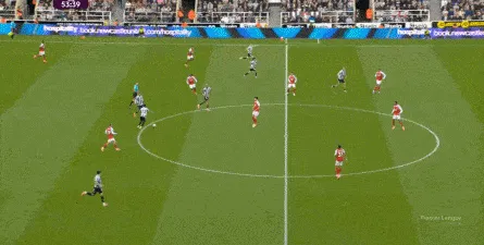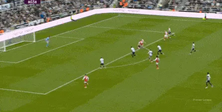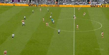 這勢(shì)必會(huì)導(dǎo)致紐卡斯?fàn)柕倪M(jìn)攻效率下降,也勢(shì)必會(huì)增加他們后場(chǎng)的危險(xiǎn),畢竟紐卡斯?fàn)柕暮髨?chǎng)也是高人林立,于是就在沃爾特馬德被搶斷的這次反擊中,阿森納反而用哲凱賴什和薩卡完成橫移,從而為特羅薩德制造了反擊戰(zhàn)中起腳的空間,距離破門只差一點(diǎn)點(diǎn):