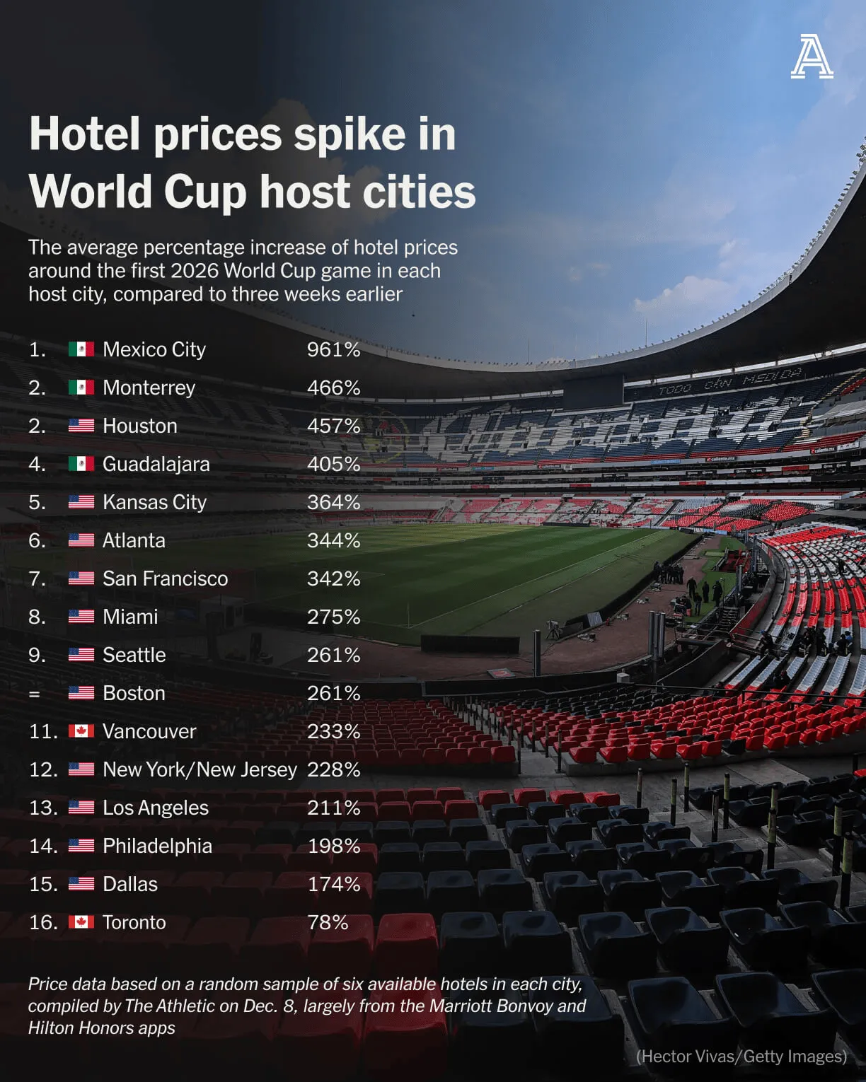 虎撲12月10日訊 The Athletic UK記者團(tuán)隊(duì)獨(dú)家報(bào)道,2026年國(guó)際足聯(lián)世界杯期間,美國(guó)、加拿大和墨西哥的酒店房?jī)r(jià)每晚上漲數(shù)百美元,16個(gè)主辦城市在揭幕戰(zhàn)前后平均漲幅超過(guò)300%。