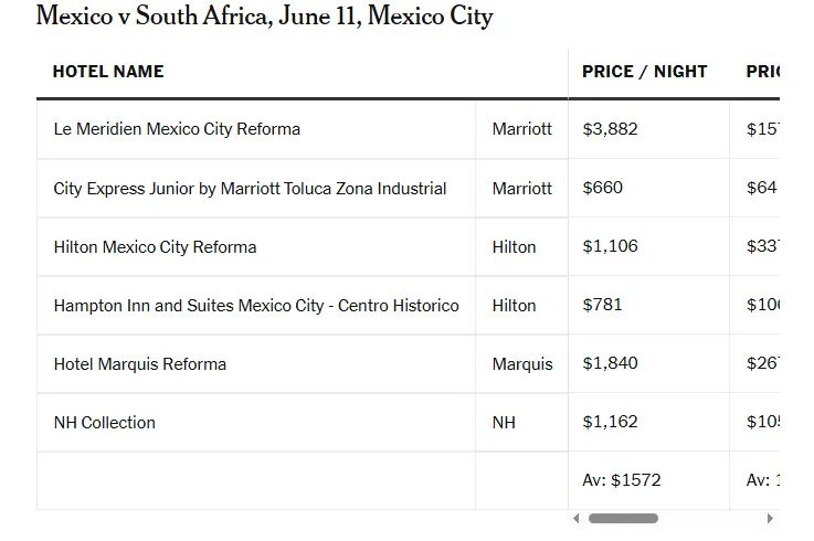 在墨西哥城的六家酒店中,平均每晚價(jià)格從三周前的172美元上漲到墨西哥隊(duì)揭幕戰(zhàn)前后的1572美元。這六家酒店的平均價(jià)格漲幅高達(dá)961%。