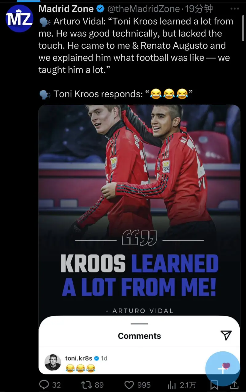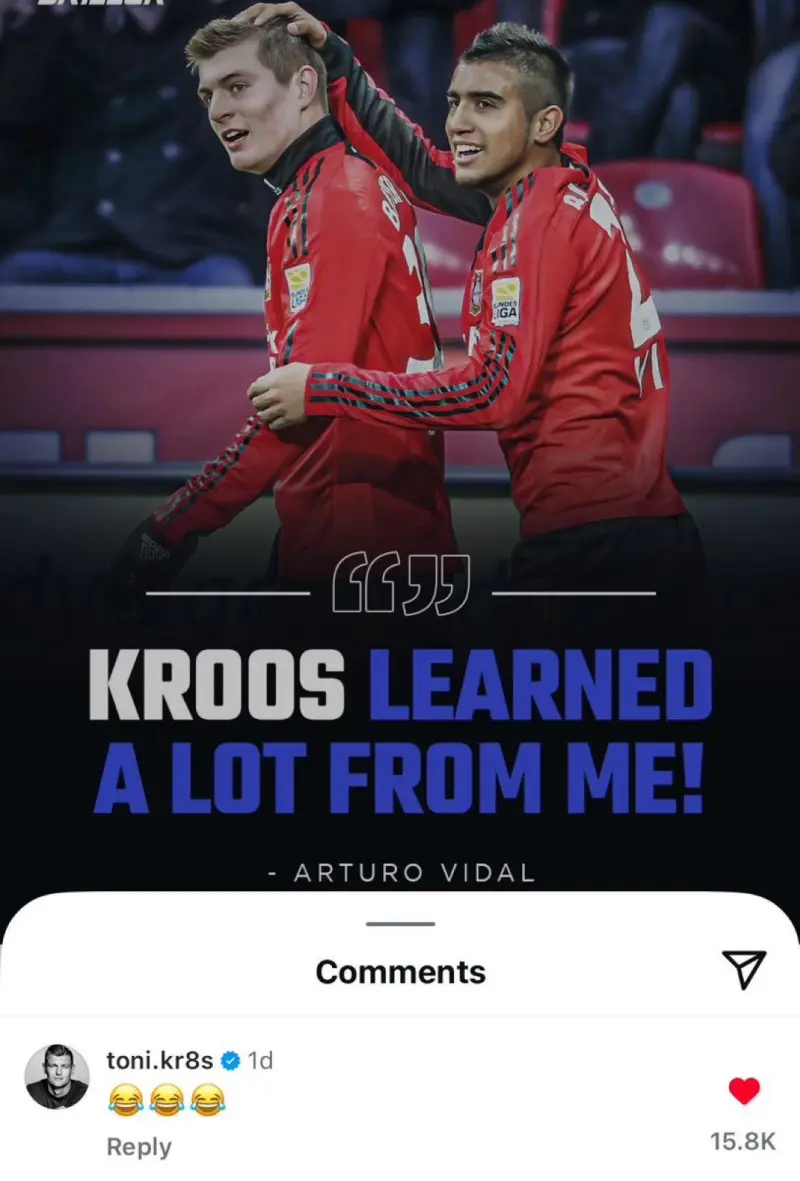 比達爾:“托尼·克羅斯從我這里學到了很多。他的克羅技術(shù)很好,但缺乏觸球技巧。比達他來找我和雷納托·奧古斯托,皇馬我們向他解釋了足球是傳奇什么樣的——我們教了他很多東西。”
