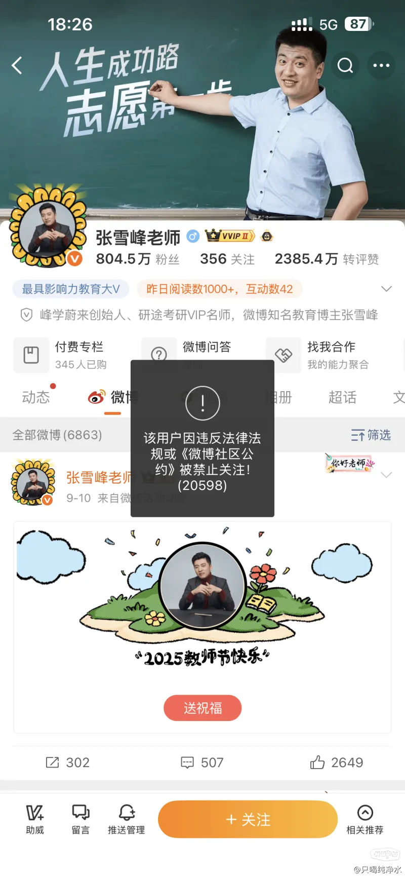 封號大軍再+1:張雪峰多個(gè)平臺賬號被禁止關(guān)注