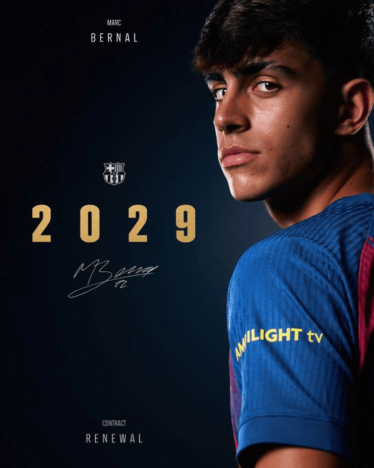 虎撲09月29日訊 巴塞羅那官方消息,與17歲中場貝爾納爾續(xù)約至2029年。薩官這位中場球員將于當(dāng)?shù)貢r間今天中午在諾坎普辦公室簽署續(xù)約合同。中場至年