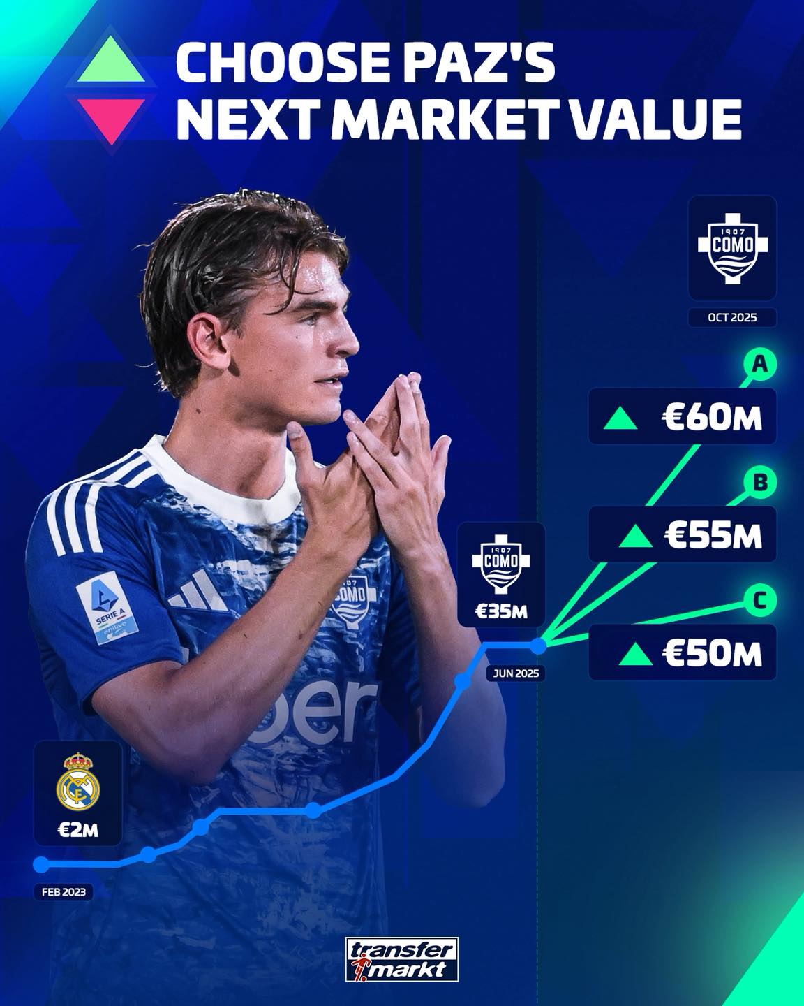 德轉(zhuǎn)更新社媒進行預(yù)熱,轉(zhuǎn)預(yù)圖中顯示尼科-帕斯的熱尼最新身價最高可達6000萬歐元。