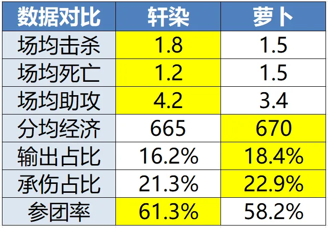 蘿卜這邊,年總的個(gè)人數(shù)據(jù)相比夏季賽進(jìn)步明顯,場均死亡數(shù)從1.8降到了1.5,傷害占比從上賽季的聯(lián)賽倒數(shù)提升到了年總中游,“KSG接對抗路”的大巴車也不再頻繁游走與各個(gè)城市。7戰(zhàn)5勝的曹操、7戰(zhàn)4勝的夏洛特、6戰(zhàn)3勝的狂鐵、2戰(zhàn)全勝的司空震,這些強(qiáng)沖陣的英雄在蘿卜手里都有不錯(cuò)的勝率。今晚蘇州KSG要想從成都AG超玩會(huì)手里多拼小分的話,蘿卜的發(fā)揮至關(guān)重要。