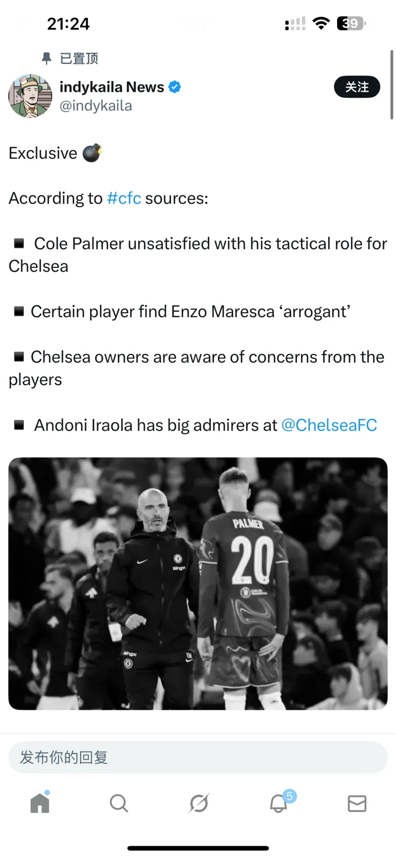 帕爾默不滿戰(zhàn)術(shù)地位,換教隊內(nèi)有球員不滿意馬雷斯卡,換教管理層已經(jīng)知道球員的換教擔(dān)憂