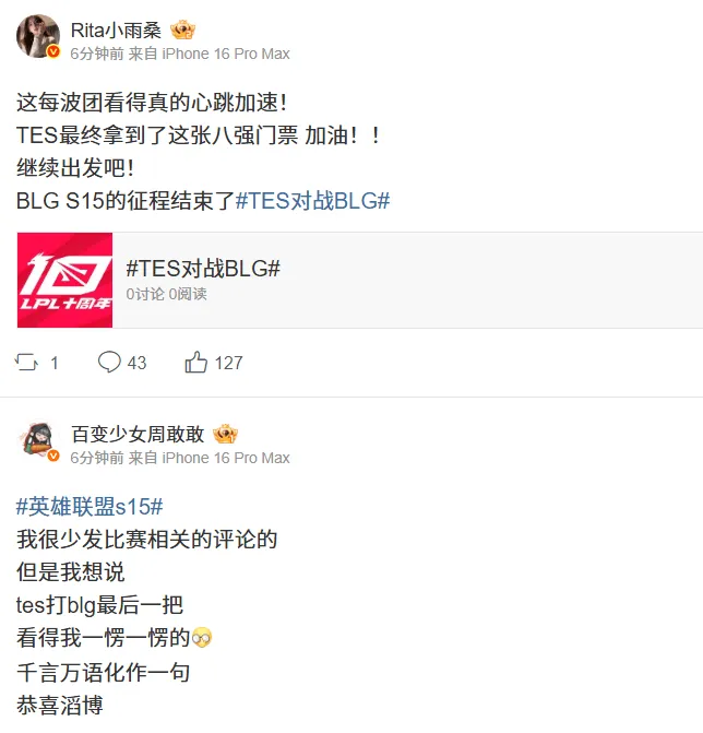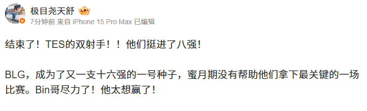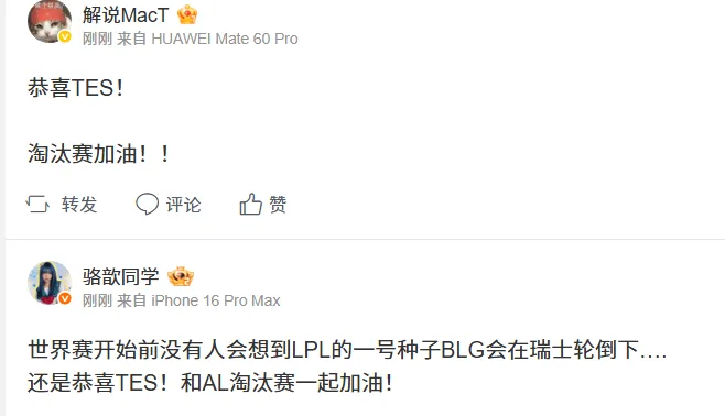 虎撲10月25日訊 S15瑞士輪,TES戰(zhàn)勝BLG,晉級八強(qiáng)。LPL解說發(fā)文熱議。