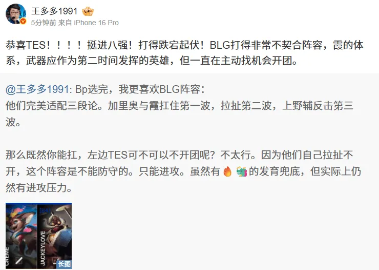 恭喜TES!!!!挺進(jìn)八強(qiáng)!打得跌宕起伏!BLG打得非常不契合陣容,霞的體系,武器應(yīng)作為第二時(shí)間發(fā)揮的英雄,但一直在主動(dòng)找機(jī)會開團(tuán)。