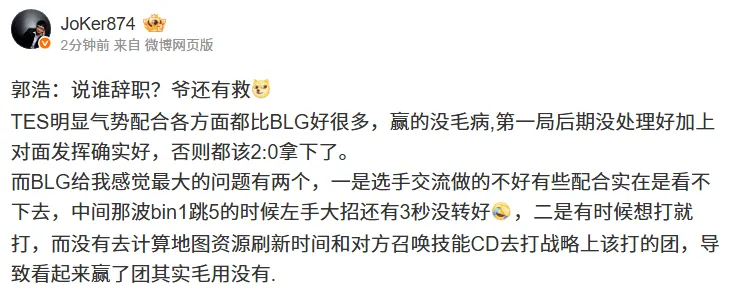 TES明顯氣勢配合各方面都比BLG好很多,贏的沒毛病,第一局后期沒處理好加上對面發(fā)揮確實(shí)好,否則都該2:0拿下了。