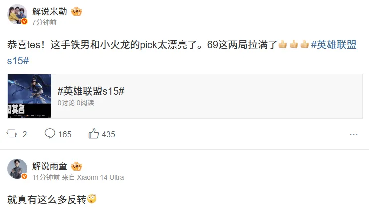虎撲10月25日訊 S15瑞士輪,TES戰(zhàn)勝BLG,說熱晉級八強(qiáng)。議B又支LPL解說發(fā)文熱議。號種